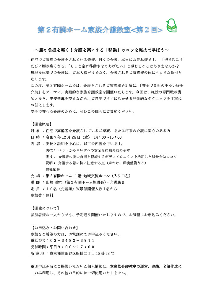 第2有隣ホームでは下記の通り、家族介護教室を実施いたします。